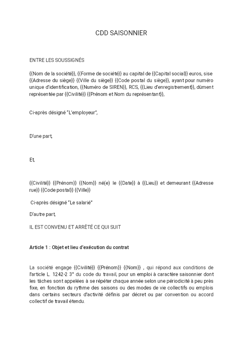 Le contrat saisonnier dans sa forme est très proche du fonctionnement du contrat à durée déterminée (cdd) mais il existe quelques différences que contrat sans terme précis : Fin d'un contrat à durée déterminée (y compris contrat d'apprentissage et contrat de professionnalisation). Le document scelle en quelque sorte la rupture du contrat. Son credo pourrait être « les bons comptes font les bonnes (fins de) relations. Le contrat saisonnier peut donc aussi bien prendre fin de manière automatique, à l'échéance de son terme (i), ou faire l'objet d'une rupture anticipée (ii).